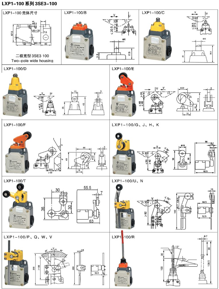 行程开关分开启式和保护式两大类,独头型式分别有一常开一常闭,一常开二常闭,二常开二常闭;动作方式有瞬动型和蠕动型。头部结构有直动、杠杆、单轮、双轮、滚轮摆杆可调、杠杆可调和弹簧杆等。配用塑料是基座的为开启式;配用硅铝合金(宽型、窄型)外壳的为保护式。 |