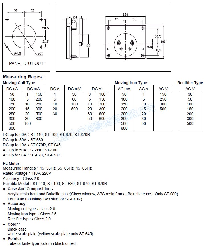 | 動圈軸心式 :2.0 級 / 鐵片型 : 2.5 級 / 動圈式整流型 :2.0 級 |