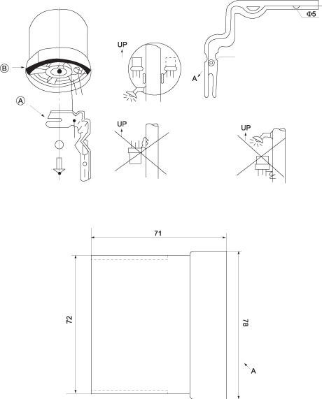 1. 不要将此装置安装在白昼间特别暗的地方或者被常闭的灯光直接照射的地方。 2. 务必使支架的A点朝向所指示的B点上。