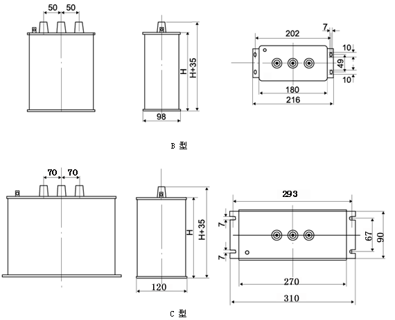 5、通风散热:设置两个以上的电容器时,间距>30mm以上,夏季温度较高时应采取有效的散热措施。 |
