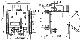 DW15-200、400、630万能式断路器 该断路器为立体布置形式,触头系统、快速电磁铁、左右侧板均安装在一块绝缘板上。上部装有灭弧系统,操作机构可装在正前方或右侧面。有“分”,“合”指示及手动断开按钮。其左上方装有分励脱扣器,背部装有与脱扣半轴相连的欠电压脱扣器。速饱和电流互感器或电流电压变换器套在下母线上。欠电压延时装置、热继电器或半导体脱扣器均可分别装在下方。