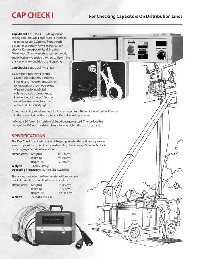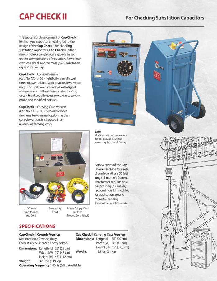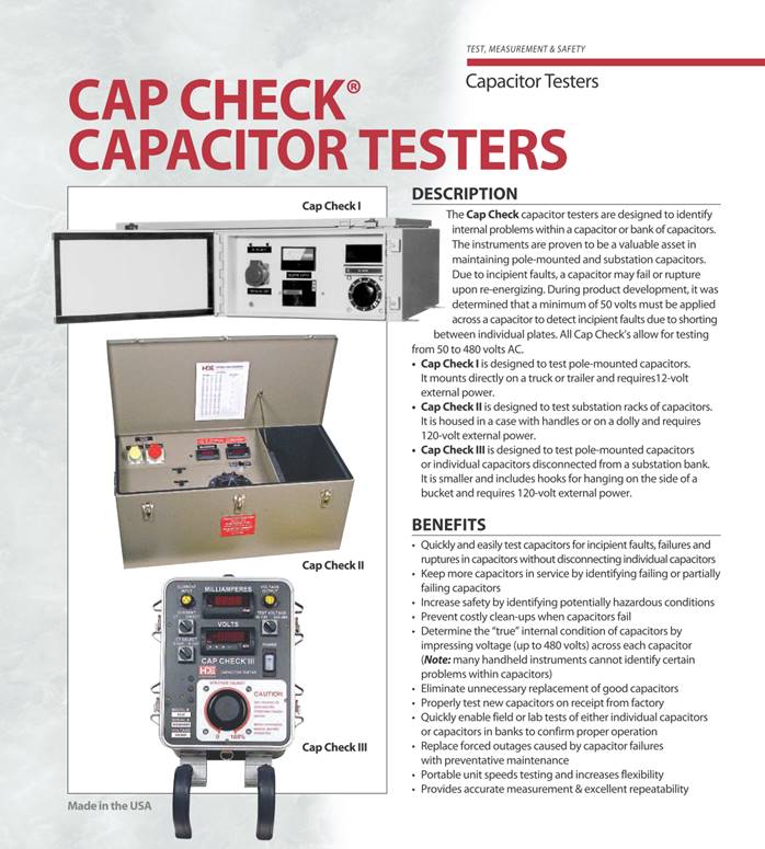 Capacitor Testers The Cap Check® line of capacitor testers is designed to identify internal problems with a capacitor or capacitor bank. The instruments are proven to be a valuable asset in maintaining both pole-mounted and substation capacitors. The testers will identify bad or failing capacitors that may rupture upon energizing. Cap Check III is designed for pole mounted and individual capacitors and can enable a two-man crew to check a bank of 12 in about 20 minutes. Cap Check II is based on the same principles and specifically designed for checking capacitor units in substation banks.
