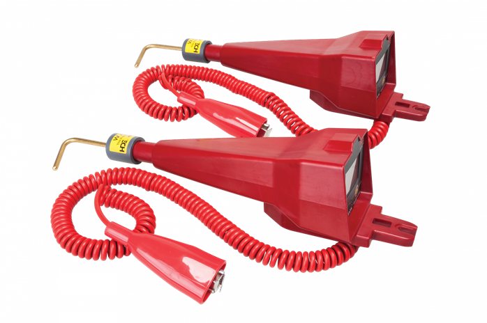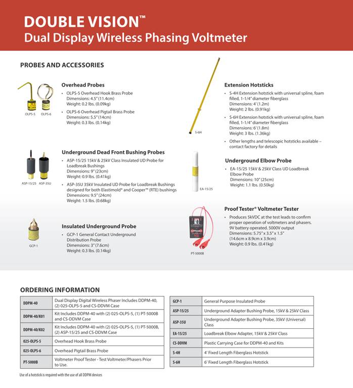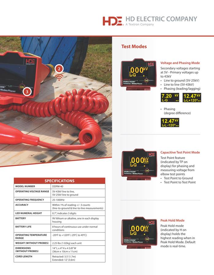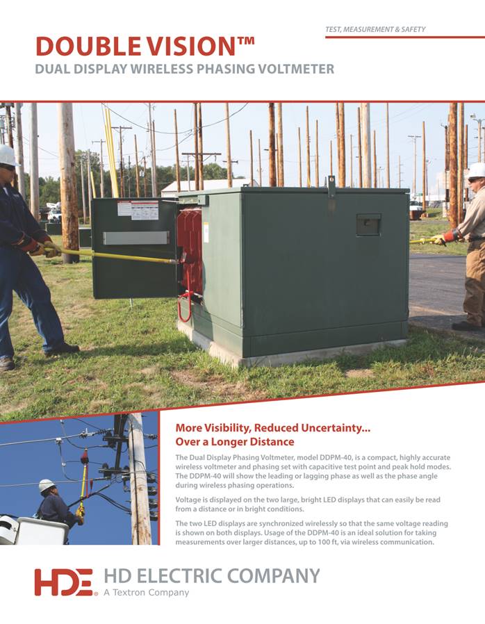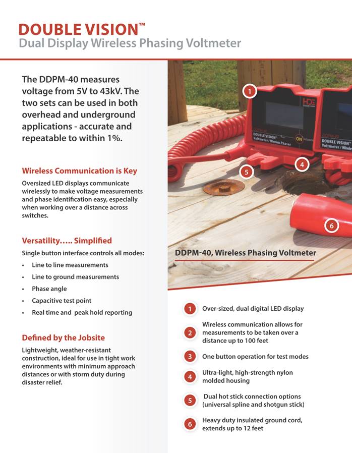 DoubleVision Dual Display Phasing Voltmeter The Double Vision® Dual Display Phasing Voltmeter, model DDPM-40, is a compact, highly accurate wireless voltmeter and phasing set with capacitive test point and peak hold modes. The DDPM-40 will show the leading or lagging phase as well as the phase angle during wireless phasing operations. The DDPM-40 measures voltage from 5V to 43kV. The two sets can be used in both overhead and underground applications - accurate and repeatable to within 1%. Voltage is displayed on the two large, bright LED displays that can easily be read from a distance or in bright conditions. The two LED displays are synchronized wirelessly so that the same voltage reading is shown on both displays. Usage of the DDPM-40 is an ideal solution for taking measurements over larger distances, up to 100 ft, via wireless communication. Wireless Communication is Key - Oversized LED displays communicate wirelessly to make voltage measurements and phase identification easy, especially when working over a distance across switches. Versatility . .