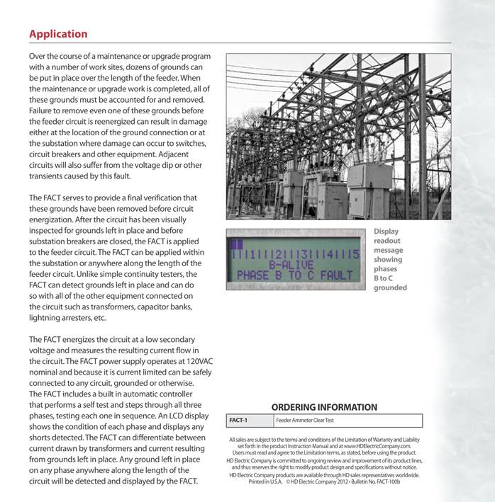 Feeder Ammeter Clear Test The FACT, Feeder Ammeter Clear Test, prevents damage to distribution feeder circuits by detecting ground connections before a feeder is energized. Distribution feeder circuits can be temporarily taken out of service for planned or unplanned maintenance. This maintenance can include replacing crossarms or insulators, reconductoring, replacing certain transformers or any other task that cannot be readily performed on a live circuit. Typical work safety practices require the installation of bolted grounds on all three phases at every location where work is being performed. Feed circuits are typically deenergized at a substation. Feeder Ammeter Clear Test Features · Alerts users to grounds left in place before the circuit is energized · Prevents fault currents, transformer damage and blown fuses · Fully automated test procedure · Display shows instructions, messages and ammeter current · Internal diagnostics confirm proper operation · Automatically detects incorrect polarity · Easy to use · Portable, one person design · Built-in self test · 5 amp output, current limited · Requires 120VAC, 60Hz power HD Electric Company is committed to ongoing review and improvement of its product lines, and thus reserves the right to modify product design and specifications without notice.
