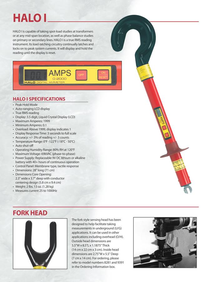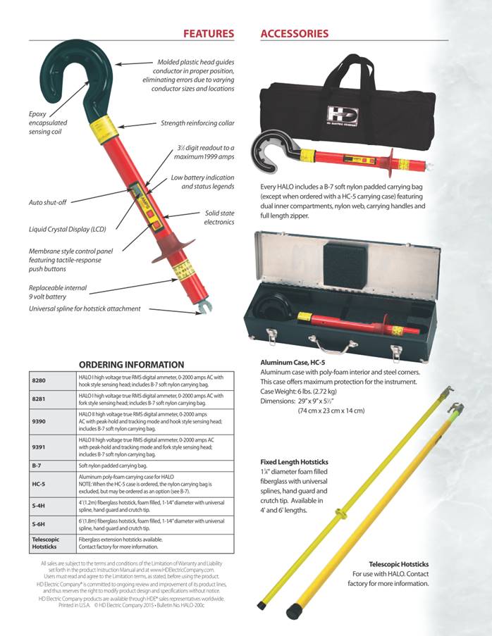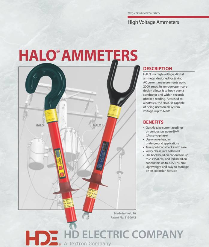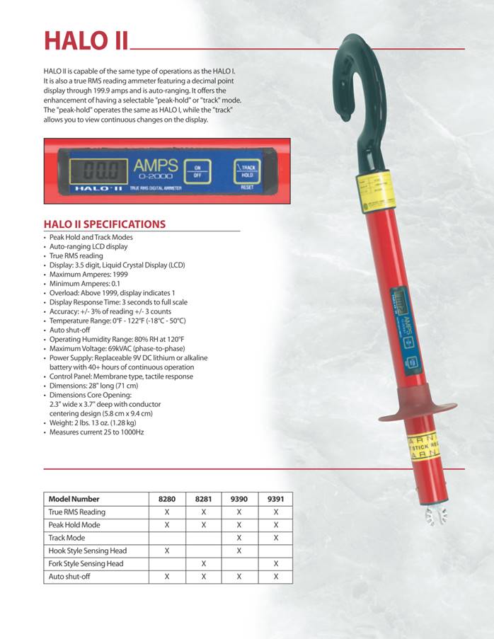 High Voltage Digital Ammeter The HALO® is a high voltage digital ammeter for use on power distribution systems designed to take True RMS AC current measurements. Its open-core design allows the user to quickly hook it over a conductor from the end of a hotstick and obtain a current reading in amperes. The HALO can be used to take spot load measurements on a single phase, as well as take readings on all three phases to determine load balance. There are two models, the HALO I and the HALO II. The HALO I has a peak-hold mode so the reading is stored on the display until reset. The HALO II includes the peak-hold mode and also a tracking mode that allows the user to view continuous changes on the display. The unit can be used on any voltage up to 69kV system voltages. It is available with either a hook-style or fork-style sensing head. The HALO can be used over insulated cable. However, it cannot be used over shielded cable, such as the concentric neutral. High Voltage Ammeter Features · For use on voltages up to 69kV class (40kV line-to-ground) · True RMS reading instrument · 0-2000 amp auto-ranging LCD display · Track and peak-hold modes available · Hook or fork style sensing heads · Universal spline for standard hotstick attachment · Powered by a field replaceable 9V lithium or alkaline battery · Auto shut-off HD Electric Company is committed to ongoing review and improvement of its product lines, and thus reserves the right to modify product design and specifications without notice. HALO系列真有效值电流表 产品特点: HALO 系列电流表功能列表