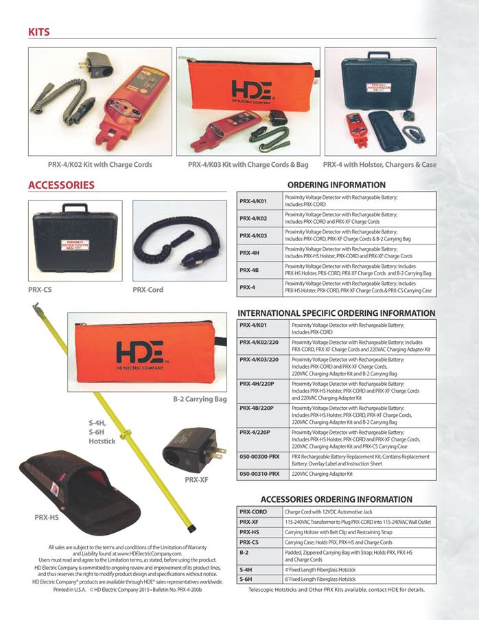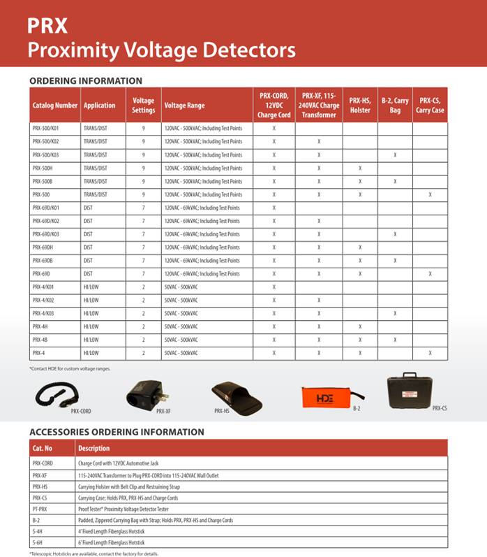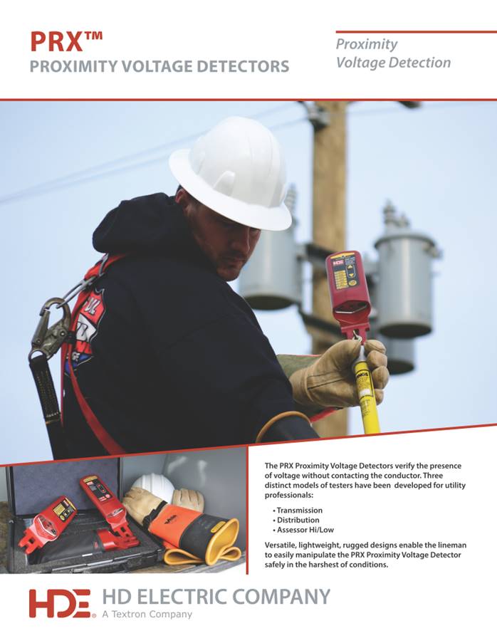 Proximity Voltage Detector The PRX-4 Proximity Voltage Detector provides utility professionals, arborists and first responders with a safety tool that will alert them to potentially dangerous high voltage in their work areas. The PRX-4 is a non contact detector with two voltage ranges: · 50V – 4kV, 3” (8cm) detection range · 4kV – UP, 10” (25cm) detection range The PRX-4 utilizes a rugged, durable, water resistant housing with dual hotstick connections - universal spline and shotgun stick. All of this is achieved while weighing less than 1 pound (.45kg). Proximity Voltage Detector Features · Sealed to resist water penetration in typical outdoor environments · Two voltage ranges from 50V to 4kV and above 4kV · Detects voltages typically 3” (8cm) from the source at the 50V setting and 4kV at 10” (25cm) at the 4kV setting · Higher voltages result in greater detection distances · Rechargeable battery with quick recharge - 15 minutes for a full day of use · Heartbeat signal assures that the PRX is ready to detect voltage · Rugged, durable housing · Dual hotstick connections - universal spline & shotgun stick · Loud beeper and LED lights indicate voltage · Weighs less than 1 pound (0.45 kg) · Easy to use electronic touch pad with large buttons · Can be used on 50Hz and 60Hz systems HD Electric Company is committed to ongoing review and improvement of its product lines, and thus reserves the right to modify product design and specifications without notice. PRX系列非接触式验电器 PRX系列包含以下型号: 产品特点: PRX非接触式验电器参数表