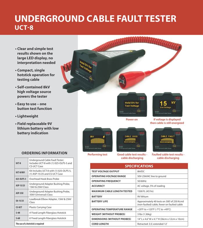 Underground Cable Fault Tester Raise the Standard - The All New Dimension of Underground Cable Fault Testing The Underground Cable Fault Tester, model UCT-8, is a lightweight, one-piece operation for underground DC leakage current testing. This tool is used to test the de-energized primary shielded voltage cable for a fault. Test results are clearly displayed as an analog bar graph along with an indication of a good or faulted cable. A self-contained 8kV high voltage source powers the tester using a 9V lithium battery, making the UCT-8 a compact single hotstick operation tool for testing cable. Underground Cable Fault Tester Features · Clear and simple test results shown on the large LED display, no interpretation needed · Compact, single hotstick operation for testing cable · Self-contained 8kV high voltage source powers the tester · Easy to use – one button test function · Lightweight · Field replaceable 9V lithium battery with low battery indication HD Electric Company is committed to ongoing review and improvement of its product lines, and thus reserves the right to modify product design and specifications without notice.