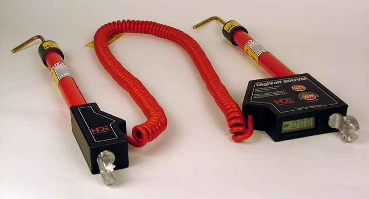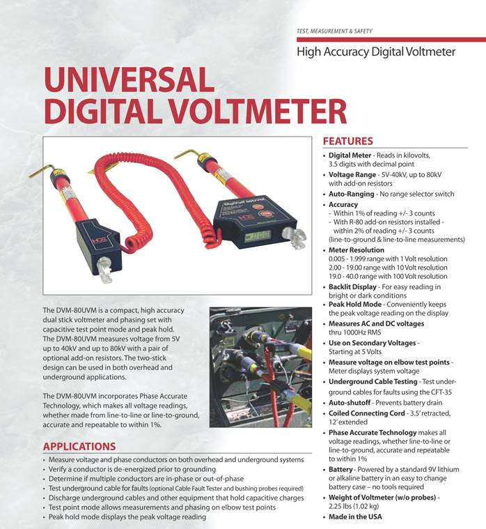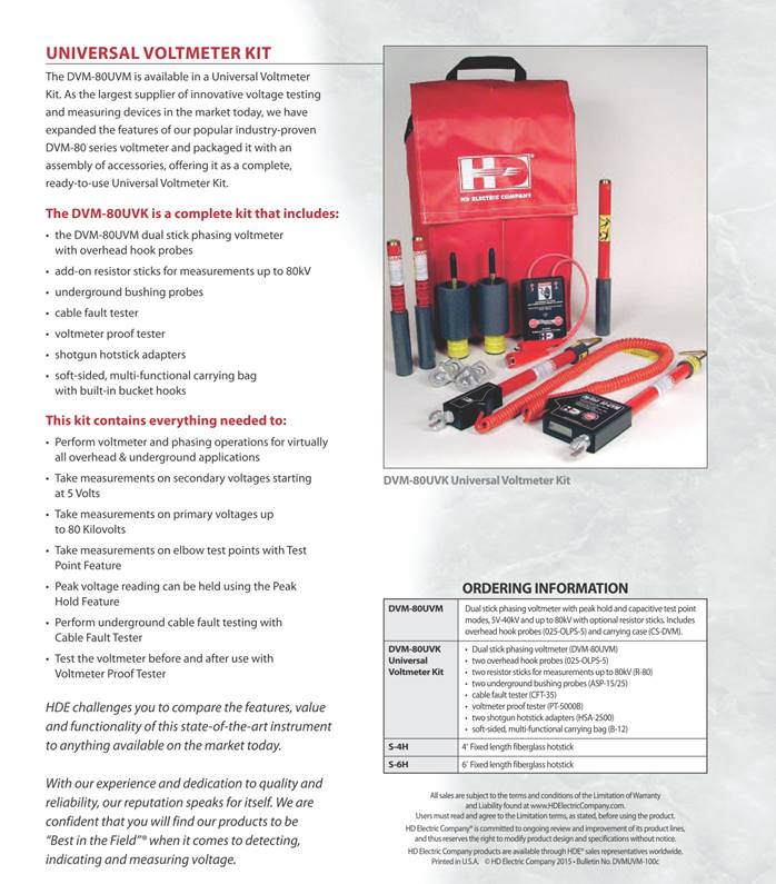 Universal Digital Voltmeter and Kit The DigiVolt® series of digital voltmeters and phasing sets is designed to take voltage measurements and perform phasing applications on system voltages up to 80kV. The DVM-80UVM is a compact, high accuracy dual stick voltmeter and phasing set with capacitive test point mode and peak hold. The DVM-80UVM measures voltage from 5V up to 40kV and up to 80kV with a pair of optional add-on resistors. The two-stick design can be used in both overhead and underground applications. The DVM-80 units incorporate Phase Accurate Technology, which makes all voltage readings, whether made from line-to-line or line-to-ground, accurate and repeatable to within 1%. The DVM-80UVM is available in a Universal Voltmeter Kit. We have packaged it with an assembly of accessories, offering it as a complete, ready-to-use Universal Voltmeter Kit. Priced competitively as a complete kit, this may be the best value in the market today. Features and Benefits · Peak Hold mode · Triple auto ranging 3.5 digit display - reads in kilovolts from 5 Volts to 80kV · Highly accurate, within 1% of the reading · Backlit display for easy reading in bright or dark conditions · Measures AC and DC voltages · Use on secondary voltages, starting at 5 Volts · Measure voltage on elbow test points, meter will display the system voltage · Test underground cables for faults · Auto shut-off · Powered by a 9V lithium or alkaline battery in an easy to change battery case - no tools required · Voltmeter weights 2.25 lbs. The DVM-80UVK is a complete kit that includes the DVM-80UVM dual stick phasing voltmeter with overhead hook probes, add-on resistor sticks for measurements up to 80kV, underground bushing probes, cable fault tester, voltmeter proof tester, shotgun hotstick adapters and a soft-sided, multi-functional carrying bag with built-in bucket hooks. This kit contains everything needed to: · Perform voltmeter and phasing operations for virtually all overhead & underground applications · Take measurements on secondary voltages starting at 5 Volts · Take measurements on primary voltages up to 80 Kilovolts · Take measurements on elbow test points with Test Point Feature · Peak voltage reading can be held using the new Peak Hold Feature · Perform underground cable fault testing with Cable Fault Tester · Test the voltmeter before and after use with Voltmeter Proof Tester HD Electric Company is committed to ongoing review and improvement of its product lines, and thus reserves the right to modify product design and specifications without notice. DVM系列多功能核相仪 DVM 系列多功能核相仪参数表