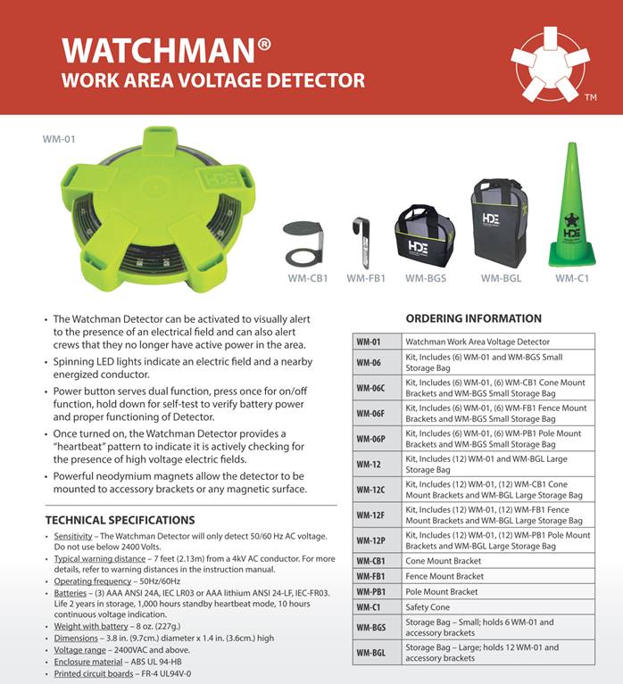 Watchman Work Area Voltage Detection Awareness and early warning - anytime, anyplace and for any reason… The Watchman® Work Area Voltage Detector, model WM-01, utilizes WAVi Work Area Voltage Indication technology to detect strong electric fields surrounding high voltage conductors and power distribution equipment. Typically placed in the vicinity of power lines or high voltage equipment, the Watchman Detector provides an extra level of safety for trained personnel working on or near high voltage systems. Features · The Watchman Detector can be activated to visually alert to the presence of an electrical field and can also alert crews that they no longer have active power in the area. · Spinning LED lights indicate an electric field and a nearby energized conductor. · Power button serves dual function, press once for on/off function, hold down for self-test to verify battery power and proper functioning of Detector. · Once turned on, the Watchman Detector provides a “heartbeat” pattern to indicate it is actively checking for the presence of high voltage electric fields. · Powerful neodymium magnets allow the detector to be mounted to accessory brackets or any magnetic surface. HD Electric Company is committed to ongoing review and improvement of its product lines, and thus reserves the right to modify product design and specifications without notice. WATCHMAN工作区电场警示器