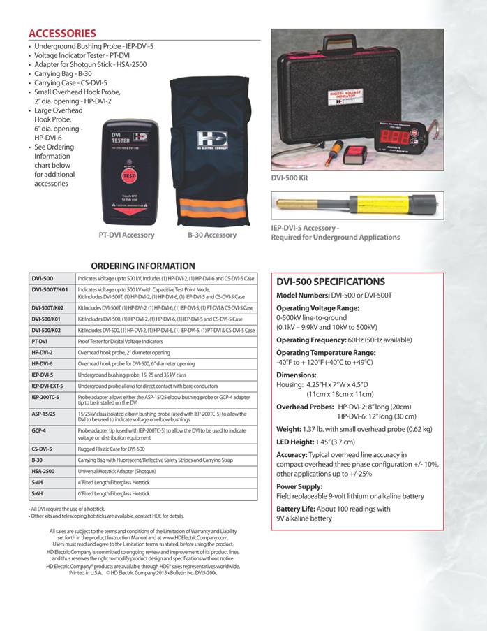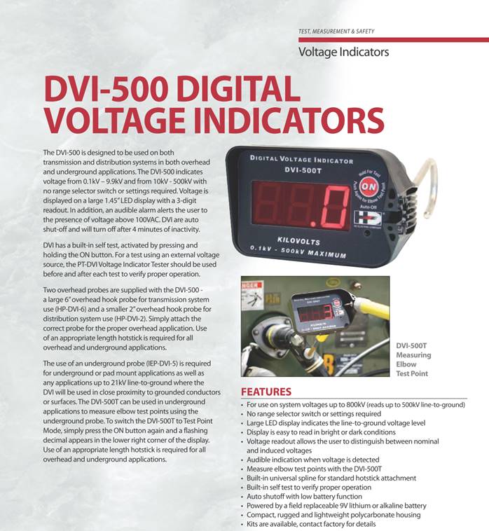 Digital Voltage Indicators - DVI-500 Series The DVI-500 Series Digital Voltage Indicators are single point instruments designed to read the voltage on a conductor up to 500kV line-to-ground. The large LED readout is easy to read on the end of a long hotstick and can be used on overhead lines or in underground applications with an underground bushing probe. There are two DVI-500 models. The DVI-500 indicates voltage from 0.1kV - 500kV on overhead and underground systems - displaying the voltage on a large 3-digit LED display. The DVI-500T with Test Point Mode has the added feature of indicating voltage on elbow test points. The DVI displays the voltage and emits an audible alarm when voltage above 100VAC is detected with no range selector switches or settings to be made - just contact the conductor and read the display. This allows the user to determine if the voltage being read is nominal or a lower induced voltage. The DVI-100 Series Digital Voltage Indicators indicate voltage up to 99kV on a two-digit display. Click here to visit the DVI-100 Series page. Digital Voltage Indicators Product Video (above) and Instructional Video (below) Digital Voltage Indicator Features · For use on system voltages up to 800kV · Large LED display indicates the line-to-ground voltage level · Display is easy to read in bright or dark conditions · Voltage readout allows user to distinguish between nominal and induced voltage levels · Audible indication of voltage detected · Built-in universal spline for standard hotstick attachment · Auto shut-off with low battery function · DVI Voltage Detector Tester (PT-DVI, optional) available as a power source to test the DVI before and after use HD Electric Company is committed to ongoing review and improvement of its product lines, and thus reserves the right to modify product design and specifications without notice. DVI系列大屏数显电压表 DVI 系列产品参数表