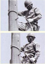 调节器操作步骤: 1.右手辅助电杆、左手将调节器下压使挂绳松脱,身体向后倾,可延长与电杆距离。 2.左手拉住挂绳末端,并用右手扶住电杆,身体向前可缩短身体与电杆之间的距离。