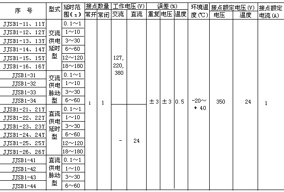 适用范围 JJSB1(JS15)系列晶体管时间继电器适用于交流50赫,电压380伏及以下,或直流24伏的控制电路中作时间元件使用。 主要技术参数 1. JJSB1系列晶体管时间继电器型号规格技术数据(见表1); 2. 继电器接点的接通与开断能力:交流400伏,功率因数为0.3-0.45安的条件下能20次接通和开断,每次间隔时间3秒, 通电时间不大于1秒; 3. 继电器的电寿命:接通380伏,0.7安,功率因数为0.6-0.7;开断380伏,功率因数为0.3-0.4的条件下,其电寿命不低于20万次; 4. 继电器的机械寿命不低于50万次。
