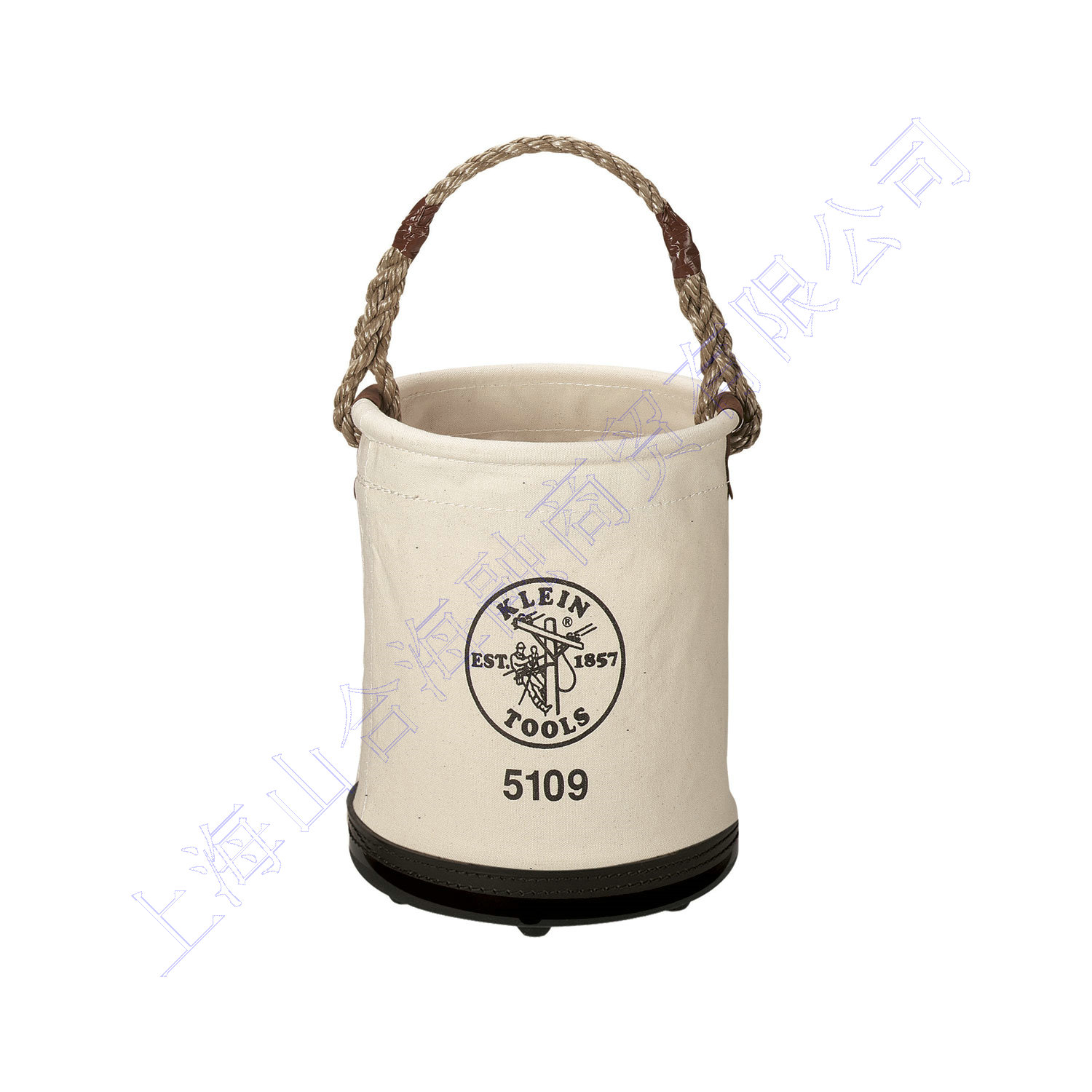 Polypropylene-rope handle reinforced with leather for water resistance and strength.
