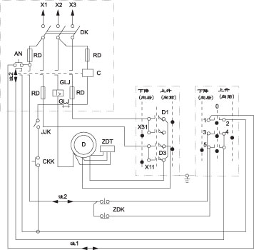 3.1 KT14凸轮控制器根据所控制的电动机型式数量不同,分: KT14-25J/1,KT14-60J/1型控制器为控制一台三相绕线型感应电动机; KT14-25J/2,KT14-60J/2型控制器为同时控制二台三相绕线型感应电动机; KT14-25J/3型控制器为控制一台三相鼠笼型感应电动机; KT14-60J/4型控制器为同时控制二台三相绕线型感应电动机(不带定子电路的触头)。
