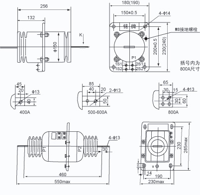 互感器为环氧树脂浇注,300/5A以下均为多匝型式半封闭浇注绝缘,300/5A以上均为单匝型式全封闭绝缘结构。 绝缘浇注体装在安装板上,其上装有铭牌、接地螺栓和安装孔,供安装使用。产品出头标记一次侧为P1、P2,二次侧为1S1、1S2、2S1、2S2分别对应为计量和监控、继电保护级。