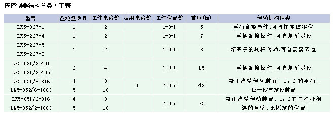 LK5系列主令控制器适用于交流50Hz,电压至380V及直流电压至440V的电路中,主要用作各类型电力驱动装置的遥远装置的遥远控制。可以控制需要较多控制电路的联锁与转换装置,适用于频繁操作任务,但它不适用于有化学活跃性、易燃性气体及充满灰尘以及非常潮湿的场所。
