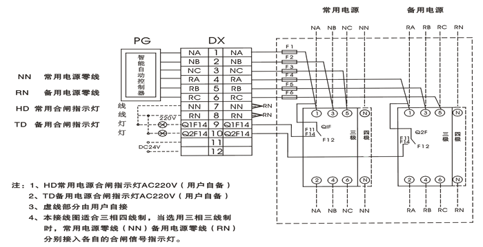 a.NA、NB、NC为常用电源指示;点亮表示正常,闲表示欠压或断相;RA、RB=RC为备用电源。