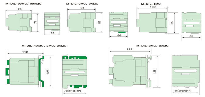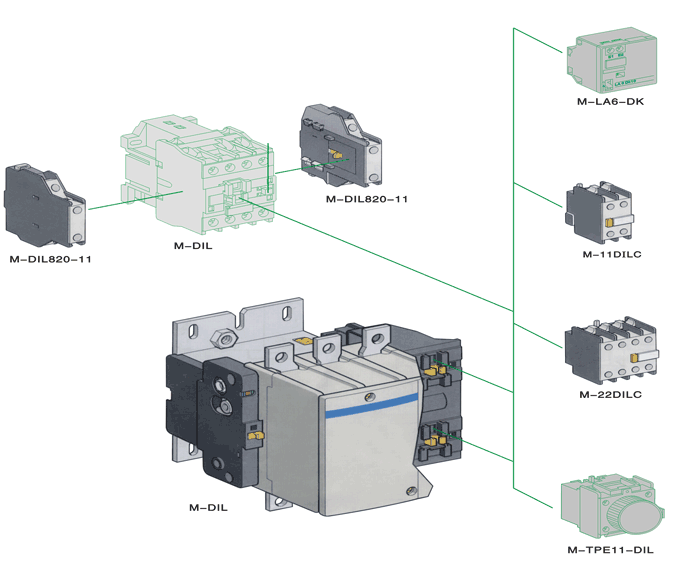 M-DIL系列交流接触器(以下简称接触器),适用于50Hz或(60Hz),配用特殊线圈可用于40~400Hz,电压至660V,电流至630A以下的电路中,用于主电路的接通和分断,并适用于电动机的频繁起动及控制;可与各种继电器等通用电气设备配套使用,用于各种电气设备、电机、电路控制。还可与辅助触头组,空气延时头、机械联锁等组成机械联锁接触器、星三角起动器、并可与热继电器组成磁力起动器。