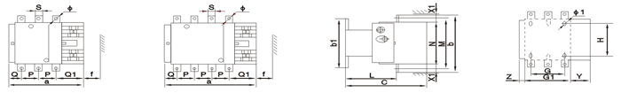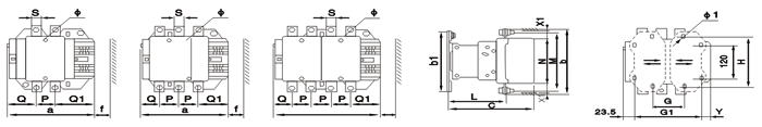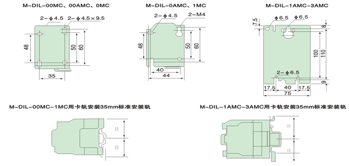 2、75mm或35mm导轨安装 | 注:3P:三对常开主触头,No:一对常开辅助触头,NC:一对常闭辅助触头