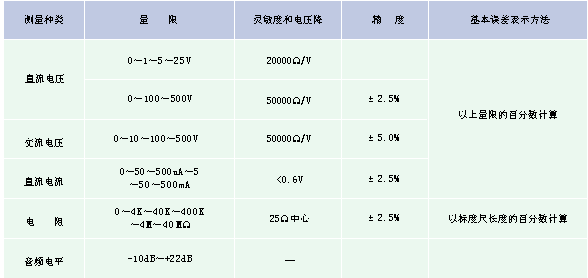本产品为高灵敏度多量限袖珍万用电表,可以测量直流电流,直流电压,交流电压,直流电阻,通过外接电路也可测音频电平、电容、电感和晶体管直流放大系数;其体积小、外形美观、量限广,携带轻便,是电子、电讯事业单位及电工器材工厂等的理想测量仪表,特别适宜需要经常流动工作的场合使用。