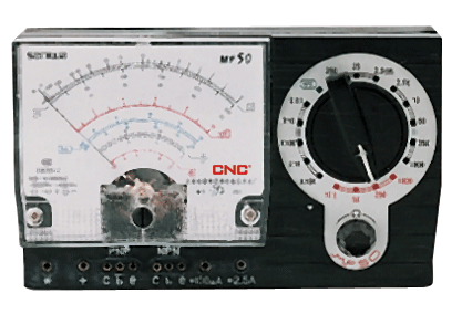 MF50型万用电表为磁电式整流系仪表,可供测量直流电流、直流电压、交流电压、电阻以及音频电平、晶体管放大系数hFE、负载电流L1、负载电压Lv、电容、电感等,适宜于电器、电子及无线电工程、业余无线电爱好者测量之用。