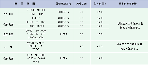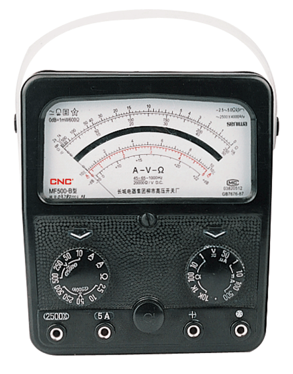 MF500-B型万用表是一种高灵敏度、多量限的携带式整流系仪表。该仪表共具有二十九个测量量限,能分别测量交直流电压、直流电流、电阻,适宜于无线电、电讯及电工事业单位作一般测量之用。 仪表适合在周围气温为0~40℃相对湿度在85%以下的环境中工作。