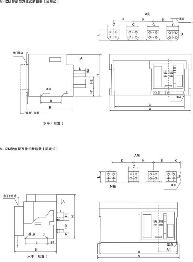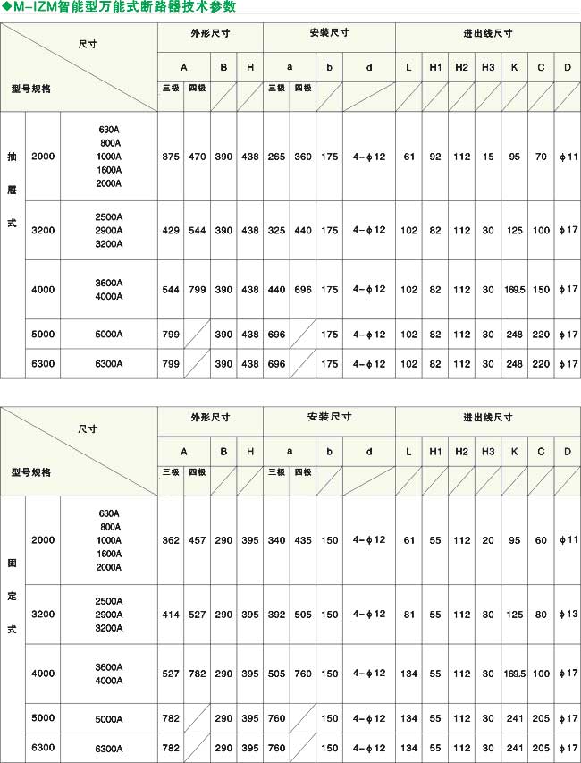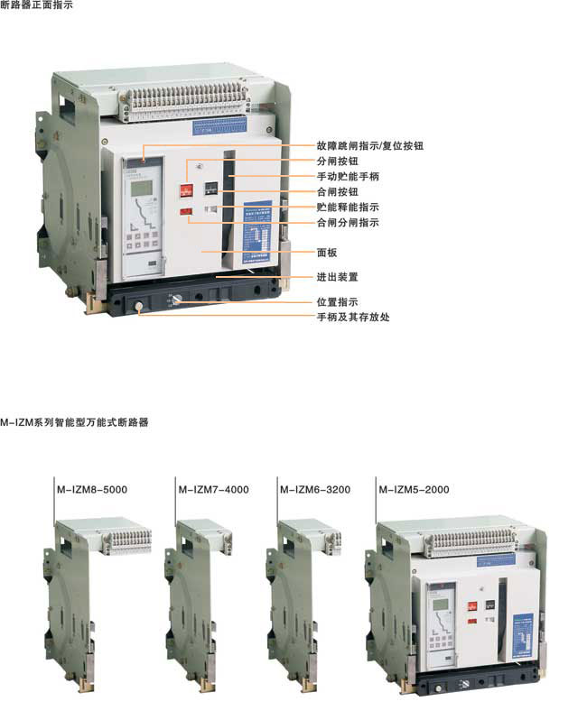 概述 M-IZM系列智能型万能式断路器用于控制和保护低压配电网络.一般安装在低压配电柜中作主开关起总保护作用.额定电流1000A及以下的断路器,还可作电动机不频繁起动之用.