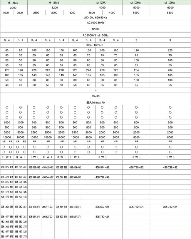 1.交流额定电流为630--6300A; 2.短路分断能力80KA--120KA(有效值); 3.额定工作电压能力AC690V以下; 4.具有3极和4极; 5.抽屉式和固定式; 6.可倒进线安装; 7.多种智能控制器,提供不同功能; 8.具有隔音功能,符号为"" 9.