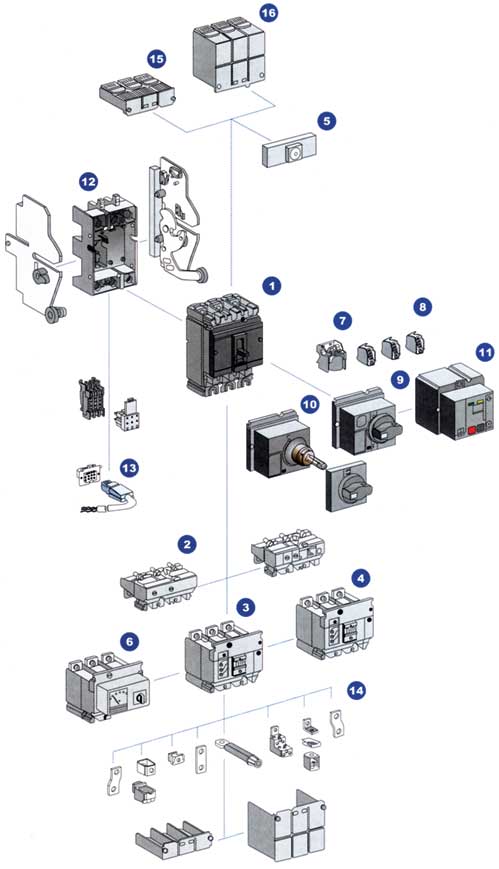 3000 | ◆模块化系统 多种附加模块的组合系统使M-NZS系列结构更回完善,脱扣元件,辅助装置和联结附件在下列各类型号中是同样的, M-NZS-100~M-NZS-250型断路器和负荷开关的通用部件如图一所示。M-NZS-400~M-NZS-630型断路器的组成结构相同。 较少的几种元件通用于所有类型。