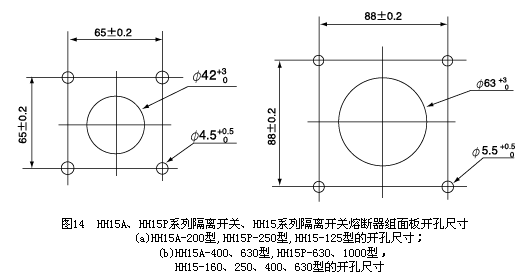| 4、HH15A、HH15P系列隔离开关,HH15系列隔离开关熔断器组面板开孔尺寸见图14 |