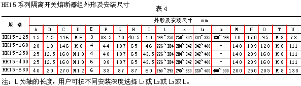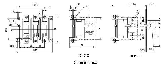 | 1、HH15系列隔离开关熔断器组外形及安装尺寸见图1 ~ 图3及表4 |
