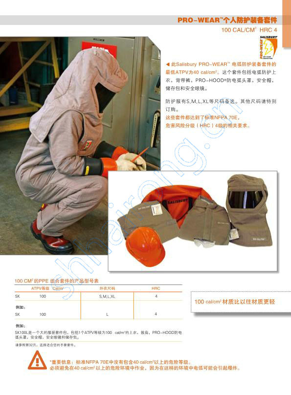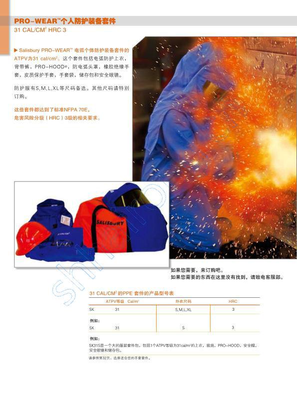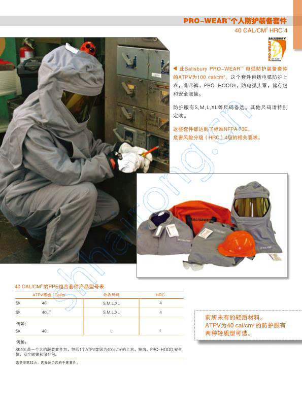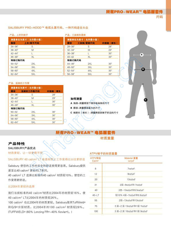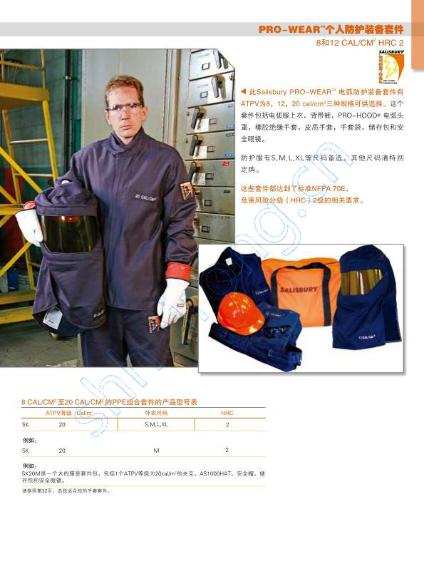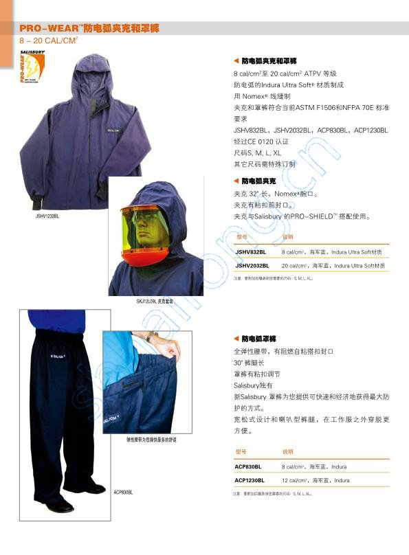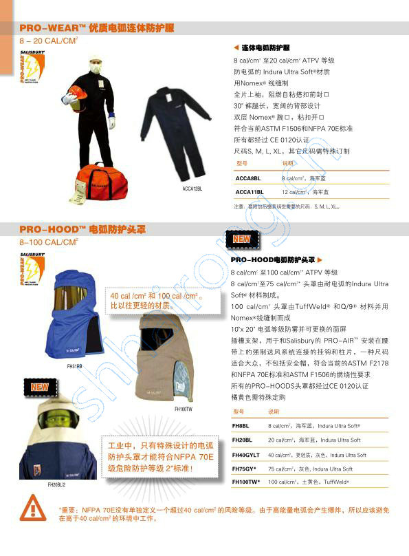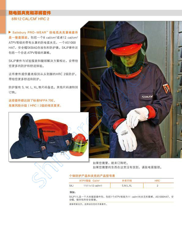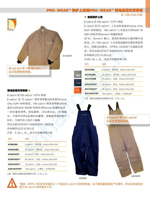 | 电弧防护产品 PRO-WEAR 电弧防护服和套件所有 PRO-WEAR 电弧防护服套件 快速查阅表 SKJ11L SK20XL 是一个为20 cal/cm等级的服装套件,包括上衣和工装裤,尺码为C大号,安全帽,安全眼镜和储存包。2 PPE的重要安全信息 关于电弧服的要求 电弧危险 “雇主应该确保每个暴 即使相对非常小的电压也可能是致命的。例如,由通常的60露在危险火花或者电弧危险中的雇员,在暴露火花或者电弧 hz交流电从手部到脚部产生的电击,持续一秒钟会产生如下危险中时,不穿着会增加雇员承受的受伤程度的服装。 后果: 当在危险环境中工作时,不应该穿着由醋酸纤维,尼龙,聚 电击后果 酯或者人造纤维的单纺或者混纺制成的服装。 电流 后果 必须确定工人暴露的环境允许穿着棉或者毛制成的服 1-3毫安 麻刺感 装。 可接受穿着由耐火材料制成,符合当前的 3+毫安 休克(疼痛) 的服装。 10+毫安 肌肉痉挛(不能控制)详述了电工穿着做电弧防护用途的纺织品。 30+毫安 呼吸停止(可能是致命的)服装必须包括表明以下信息的商标:身份跟踪代码,符合 60+毫安 心脏肌纤维震颤(通常会致命),制造商名称,保养指南和纤维含量,尺码, 4+安培 心脏停止跳动(致命)和“电弧等级”。- ATPV或EBT。 5+安培 组织燃烧(致命,重要器官毁坏) 是用于测试保护暴露在电弧中工人的产品的电 弧等级。 62 电弧防护产品 所有PRO-WEAR 电弧服套件 尺码SALISBURY PRO-HOOD? 电弧头罩尺码, 产品:上衣和裤子 产品:工装裤和罩裤 测量单位为英寸(允许Z小值) 测量单位为英寸(允许Z小值) 胸部 上衣/裤子尺码 腰部 工装裤/罩裤尺码 内接缝(裤长) 34-36" S 28-30" S 28" 38-40" M 32-34" M 29" 42-44" L 36-38" L 30" 46-48" XL 40-42 XL 30" 特别订购尺码 特别订购尺码 50-52" 2XL 44-46" 2XL 30" 54-56" 3XL 48-50" 3XL 30" 58-60" 4XL 52-54" 4XL 30" 62-64" 5XL 56-58" 5XL 30" 产品:连裤的工作服 测量单位为英寸(允许Z小值) 腰部 连裤的工作服尺码 内接缝(裤长) 34-36" S 28" 38-40" M 29" 如何测量 42-44" L 30" A 胸部-测量臂部下面环绕身体的尺寸 46-48" XL 30" 特别订购尺码 B 腰部-测量腰部Z大的尺寸 50-52 2XL 30" C 裤腿长(裤长)-测量胯部到裤子折边的尺寸 54-56" 3XL 30" 58-60" 4XL 30" 62-64" 5XL 30" 所有PRO-WEAR电弧服套件 材质重量 产品特性 SALISBURY产品优点 材质更轻,让一切变得不同 SALISBURY 40 cal/cm LT 电弧材质让工作变得比以往更舒适2 Salisbury 使您的工作的安全和舒适变得更容易。Salisbury提供 甚至比40 cal/cm 更轻的LT系列。2 40 cal/cm LT 选择比标准的40 cal/cm 材质轻 ,使您的工2 2 作变得更舒适。 我们当前标准的40 cal/cm材质比2004年的材质轻 ,使2 40 cal/cm LT比2004年的材质轻 。2 100 cal/cm 也比2004年的材质更轻。Salisbury使用TuffWeld?2 和Q/9?分层材质,比2004年的100 cal/cm2材质轻 。 63PRO-WEAR优质电弧连体防护服 8 - 20 CAL/CM2 连体电弧防护服 8 cal/cm 至20 cal/cm ATPV 等级2 2 防电弧的 Indura Ultra Soft?材质 用Nomex? 线缝制 全片上袖,阻燃自粘搭扣前封口 30" 裤腿长,宽阔的背部设计 双层 Nomex? 腕口,粘扣开口 所有都经过 尺码S, M, L, XL,其它尺码需特殊订制 型号 说明 ACCA8BL 8 cal/cm,海军蓝2 ACCA12BL 2 ACCA11BL 12 cal/cm,海军蓝 注意:要附加后缀表明您需要的尺码:S, M, L, XL。 PRO-HOODTM电弧防护头罩 2 NEW 8-100 CAL/CM PRO-HOOD电弧防护头罩 2 2* 8 cal/cm 至100 cal/cm ATPV 等级 2 2* 8 cal/cm至75 cal/cm 头罩由耐电弧的Indura Ultra 2 2 Soft? 材料制成。 40 cal /cm 和 100 cal /cm 。 比以往更轻的材质。 100 cal/cm 头罩由TuffWeld? 和Q/9? 材料并用2 Nomex?线缝制而成 10"x 20" 电弧等级防雾并可更换的面屏 插槽支架,用于和Salisbury的 PRO-AIR 安装在腰 带上的强制送风系统连接的挂钩和柱片,不包括安全帽 NEW 所有的PRO-HOODS头罩都 橘黄色需特殊定购 FH100TW 型号 说明 FH8BL 8 cal/cm,海军蓝,Indura Ultra Soft?2 FH20BL 20 cal/cm,海军蓝,Indura Ultra Soft2 工业中,只有特殊设计的电弧 FH40GYLT 40 cal/cm,更轻质,灰色,Indura Ultra Soft2 防护头罩才能符合 级危险防护等级 2*标准! FH75GY* 75 cal/cm,灰色, Indura Ultra Soft2 FH100TW* 100 cal/cm,土黄色,TuffWeld?2 FH20BL/2 *重要:没有单独定义一个C过40 cal/cm2的风险等级。由于高能量电弧会产生爆炸,所以应该避免 在高于40 cal/cm2的环境中工作。 64 电弧防护产品 PRO-WEAR防护上衣和PRO-WEAR防电弧围兜背带裤 8-100 CAL/CM2 电弧防护上衣 2 2* 8 cal/cm至100 cal/cm ATPV 等级 2 2* 8 cal/cm至75 cal/cm 上衣由防电弧的Indura Ultra 2* Soft? 材料制成。100 cal/cm 上衣是由TuffWeld? 和 Q/9? 材料并用Nomex? 线缝制而成 32"长,Nomex? 腕口,宽阔的背部设计提供额外的 2* 舒适,31-100 cal/cm 上衣有高温塑料拉链的两层前 封口,阻燃自粘搭扣,与PRO-HOODSTM头罩配合使 用, ACC10032TW 所有都 尺码S, M, L, XL,其它尺码要特殊订制 型号 说明 40 cal /cm和 100 cal /cm2 2。 ACC832BL 8 cal/cm,海军蓝,Indura Ultra Soft2 比以往更轻的材质。 ACC2032BL 20 cal/cm,海军蓝,Indura Ultra Soft2 ACC3132RB 31 cal/cm,品蓝,Indura Ultra Soft2 ACC5532GY* 55 cal/cm,灰色,Indura Ultra Soft2 ACC7532GY* 75 cal/cm,灰色,Indura Ultra Soft2 防电弧围兜背带裤 ACC10032TW* 2 2 2 100 cal/cm,土黄色,TuffWeld?8 cal/cm至100 cal/cm*ATPV 等级 2 2 注意:要附加后缀表明您需要的尺码:S, M, L, XL。 8 cal/cm 至 75 cal/cm*围兜背带裤由防电弧的Indura 2* Ultra Soft? 材料制成,100 cal/cm 围兜背带裤由防电 弧的TuffWeld? 和Q/9? 材料并用Nomex?线缝制而成 一体的重型背带,宽松裁剪,活动更自如,30"裤腿 长,可调节的带自粘搭扣的腰带,前胸围兜提供额外 2 2防护,可调节的三