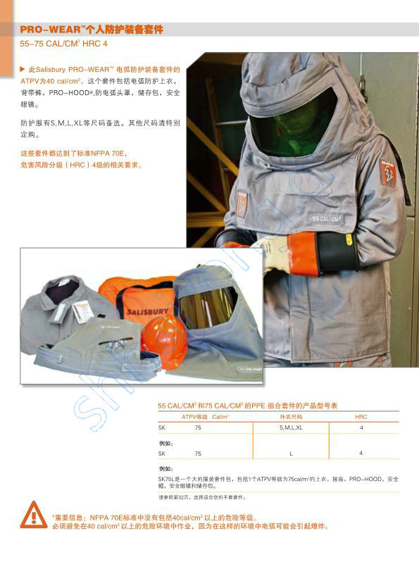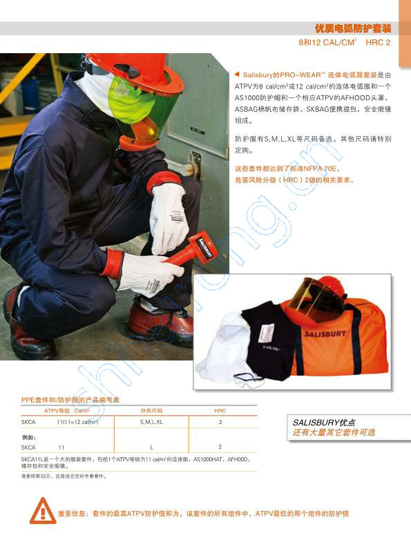 ☉这些套件都达到了,危害风险分级(HRC)2级的相关要求。 ☉中没有单独定义一个C过40cal/cm2的风险等级。由于高能量的电弧会产生爆炸,所以应该避免在高于40cal/cm2的环境中工作。 ☉这些套件里均不含防电弧手套,请参考salisbury的防电弧手套型号表中选择适合您的手套。