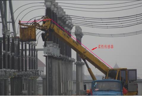 (5)主机不断采集柔性传感器上的感应信号,当感应信号大于报警阀值时,蜂鸣器鸣响,“报警输出”指示灯亮,“系统报警”指示灯亮,报警单元声光报警。此时吊车操作员应该立即停止吊臂移动。