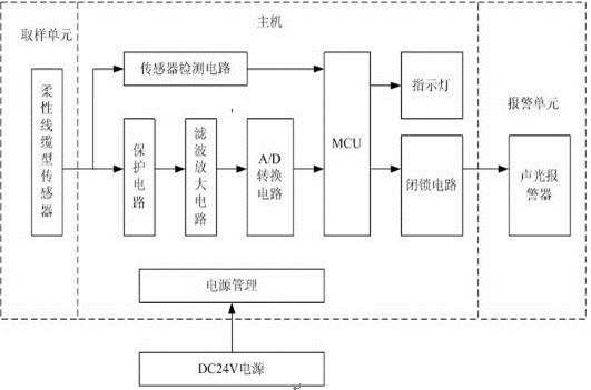 主机不断采集柔性传感器感应线路上的信号,当该信号大于报警阀值时,“报警输出”指示灯亮,蜂鸣器鸣响,“系统报警”指示灯亮,报警单元声光报警。