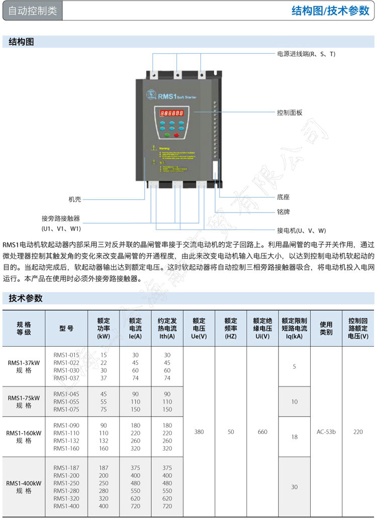 RMS1电动机软起动器内部采用三对反并联的晶闸管串接于交流电动机的定子回路上。利用晶闸管的电子开关作用,通过