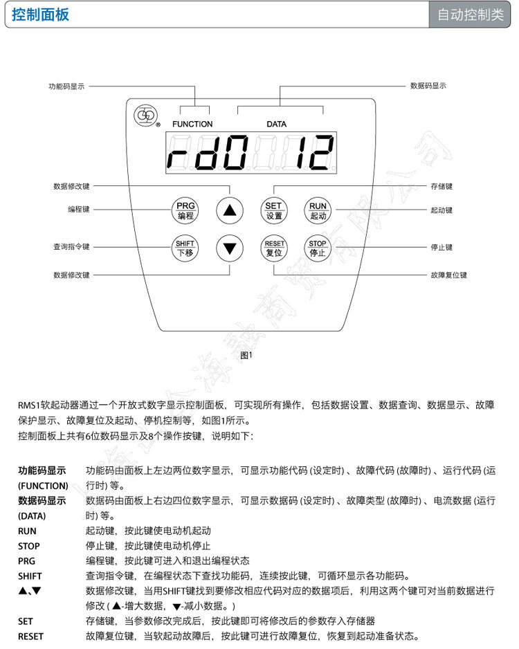 RMS1软起动器通过一个开放式数字显示控制面板,可实现所有操作,包括数据设置、数据查询、数据显示、故障