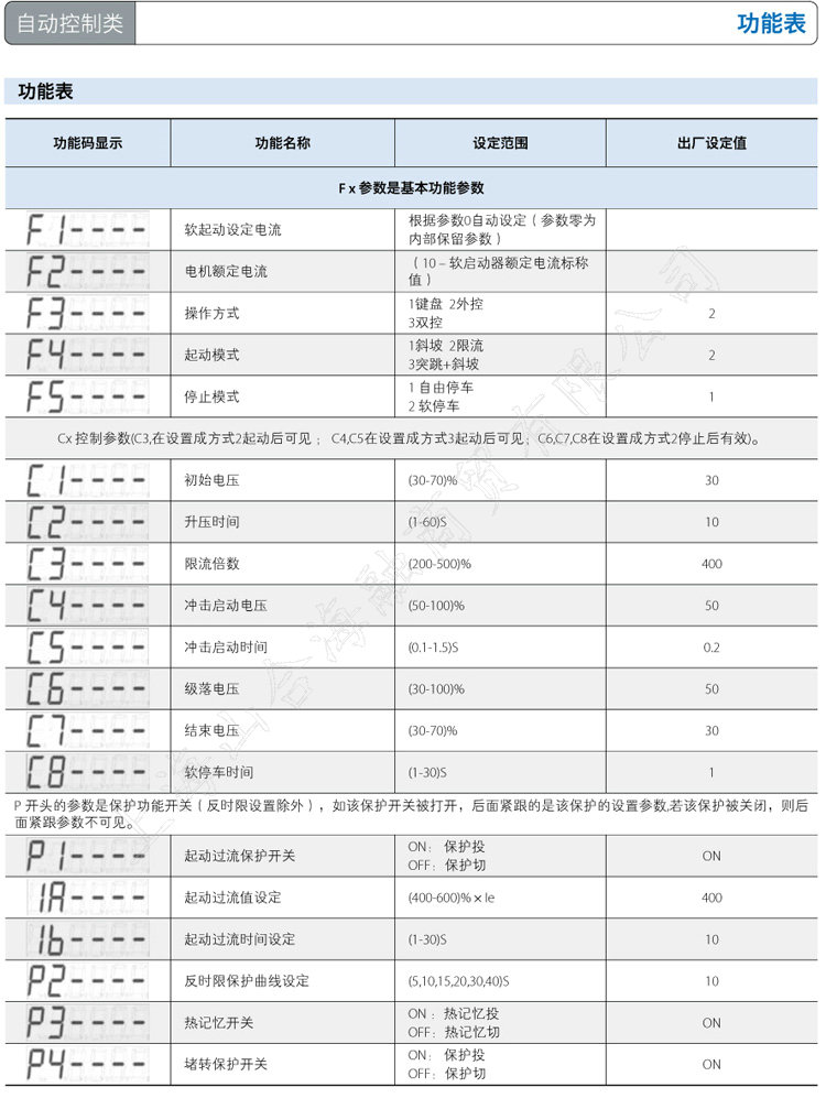 具有斜坡电压起动、限流起动及软停车功能。