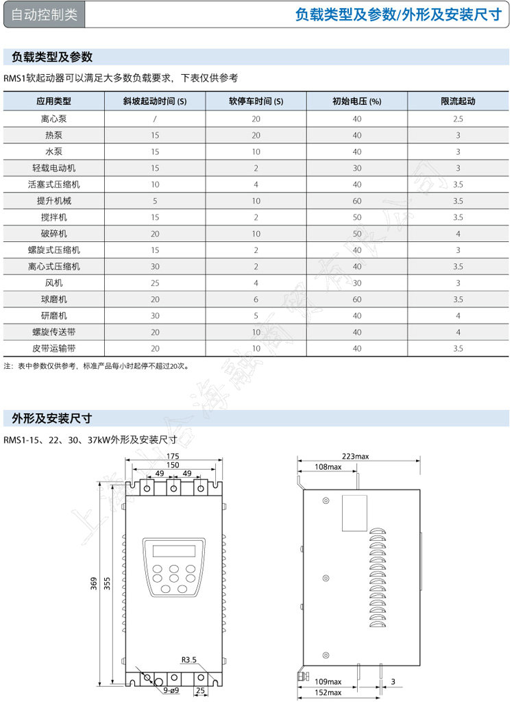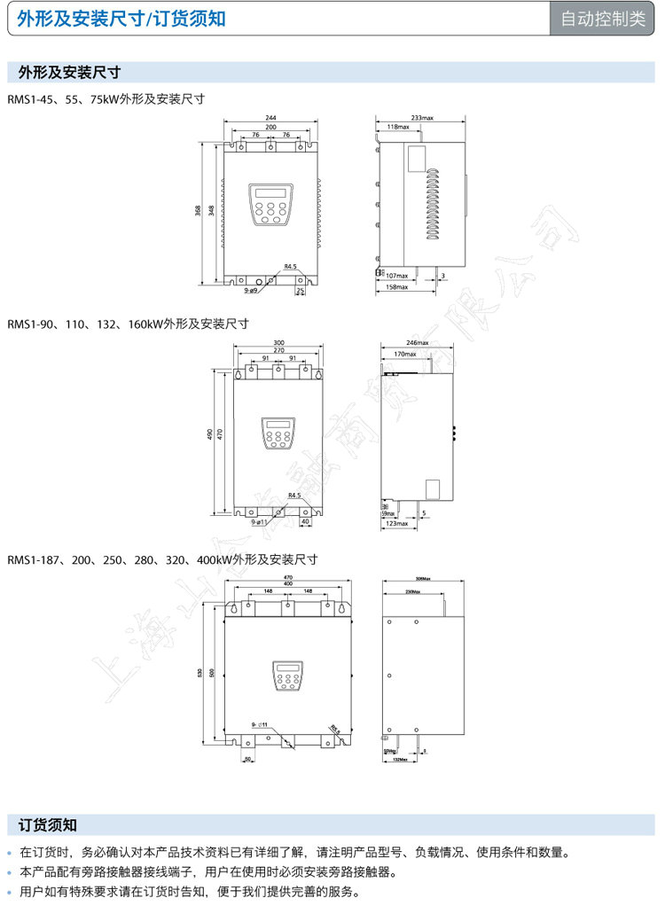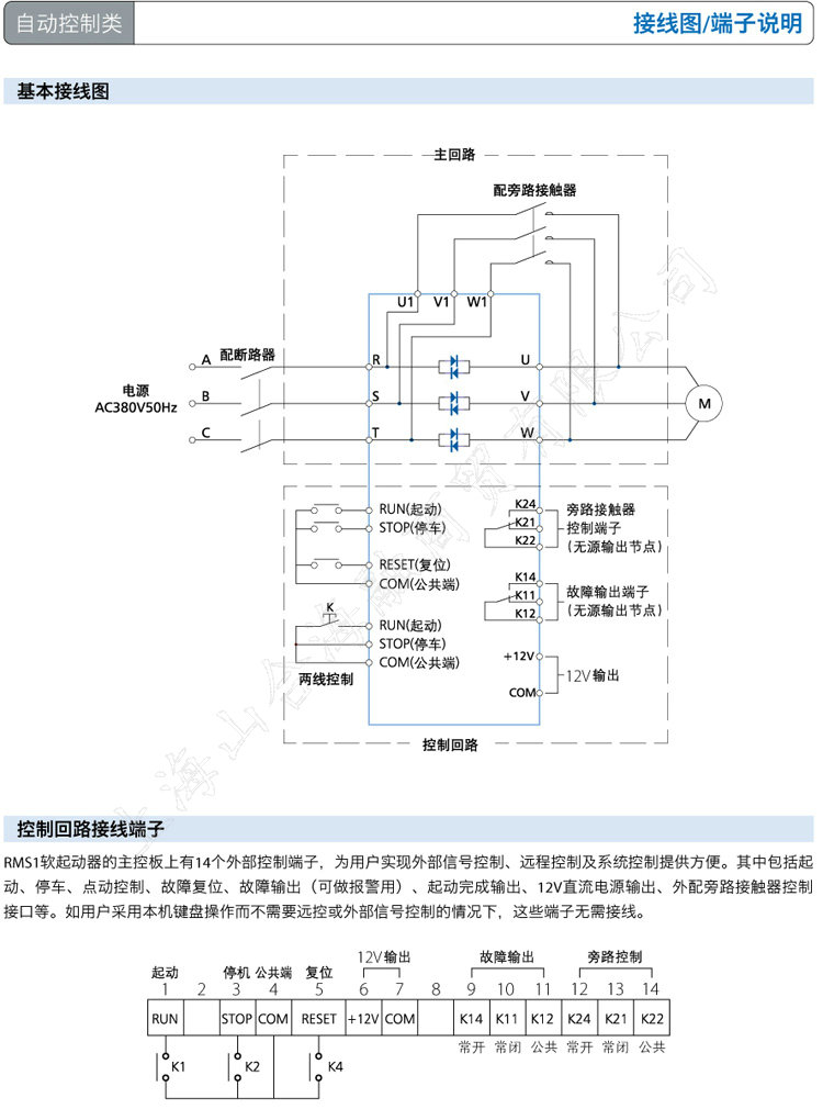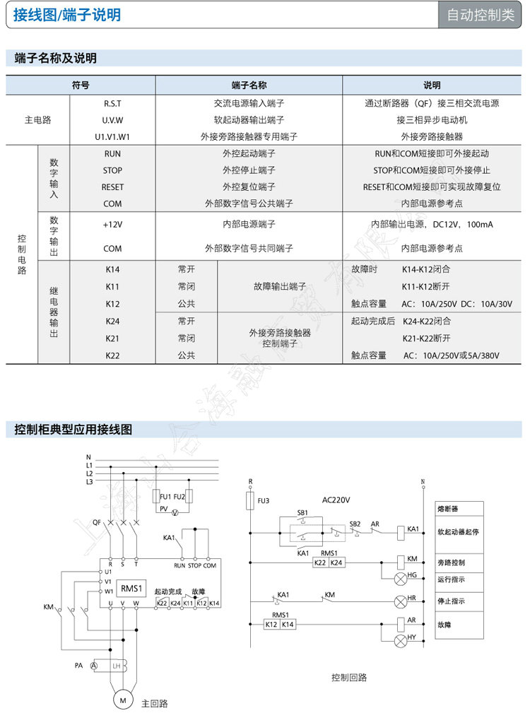 RMS1软起动器采用壁挂箱式,接线方式为三进六出,为了确保软起动器正常使用,应垂