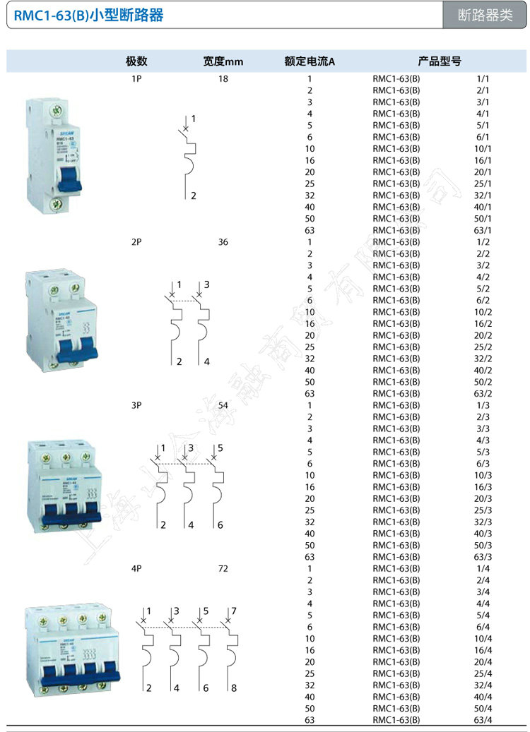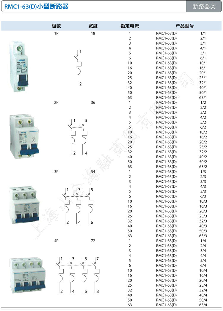 脱扣特性 B型3~5In瞬时脱扣 50、63 230/400 4.5