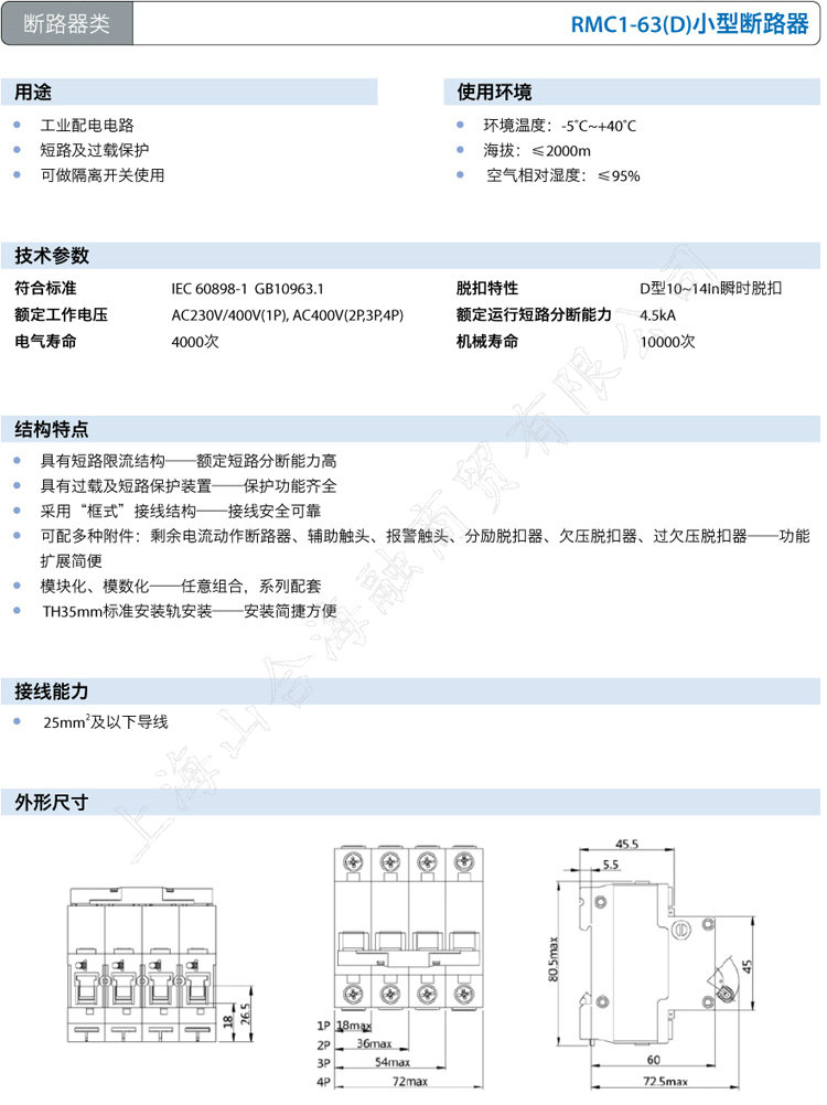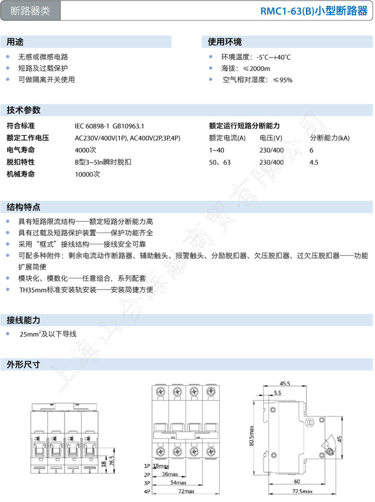脱扣特性 C型5~10In瞬时脱扣 50、63 230/400 4.5
