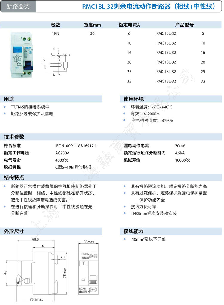 上海人民电器厂RMC1BL-32剩余电流动作断路器(相线+中性线)