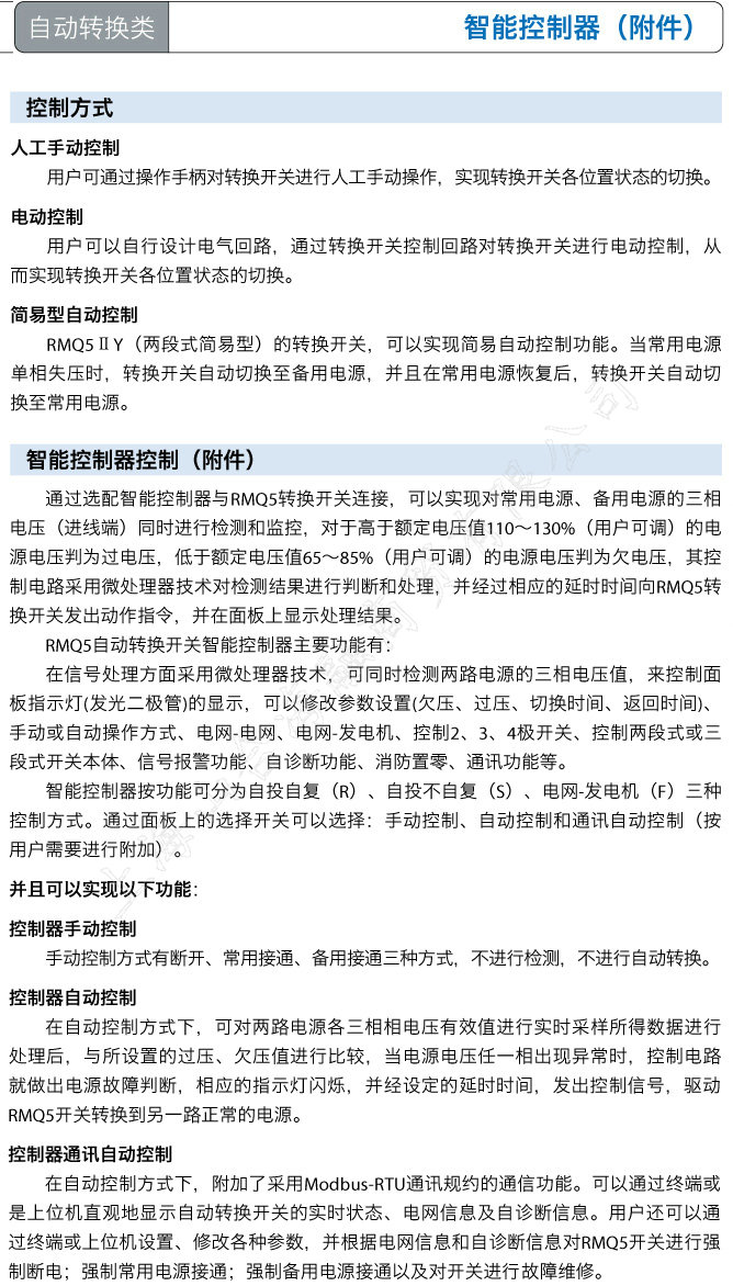 通过选配智能控制器与RMQ5转换开关连接,可以实现对常用电源、备用电源的三相