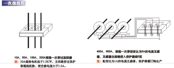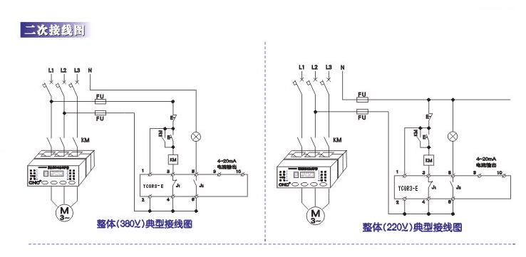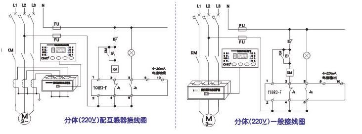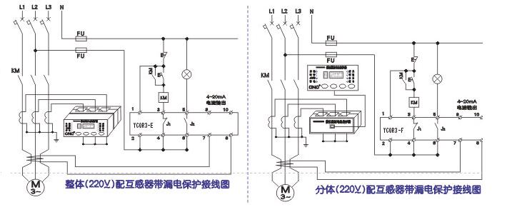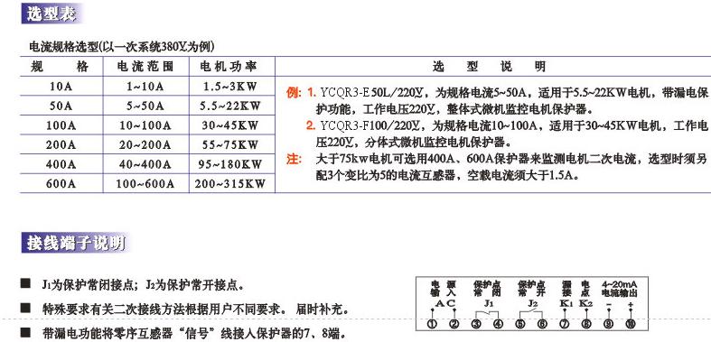 型号 YCQR3-E型 整体式适用于电机监测、保护及就地安装显示,具有固定某电流4~20mA。 YCQR3-F型 分体式适用于电机监测、保护及就地安装显示,由于体单元及电流传感器组成,主体单元与显示单元这间距离≤5m,具有固定某相电流4~20mA信号输出。